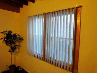 Above is another panoramic view from the kitchen and on the right are brand new vertical blinds for your bight living room.
